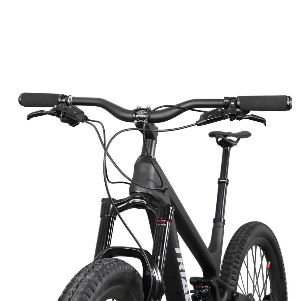 To make getting up and downhill that little bit easier and less of pain, we have fitted the 150mm X-Fusion Manic dropper post. You’ll be able to pedal nicely uphill and then drop your saddle for some downhill shenanigans on the descent. While we mention saddles, the saddle on this bike is our carbon fiber railed model, which matches nicely with our carbon fiber stem and handlebar.